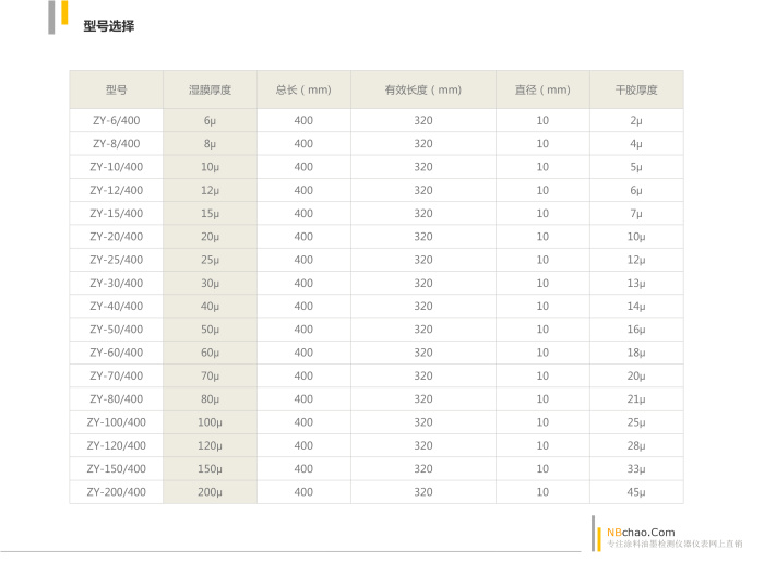 中國| 型號 | 濕膜厚度 | 總長度 | 有效長度 | 直徑 | 精度 |